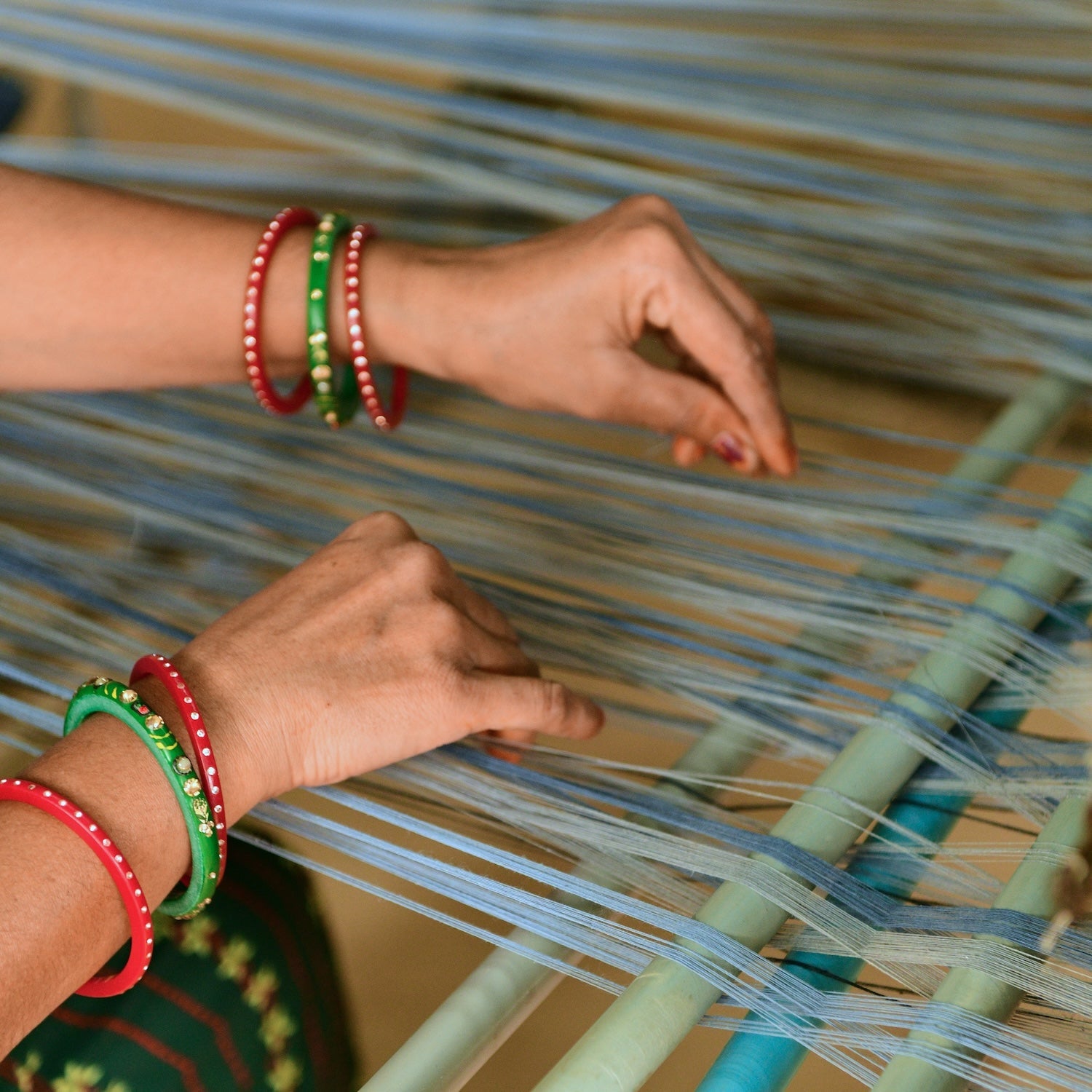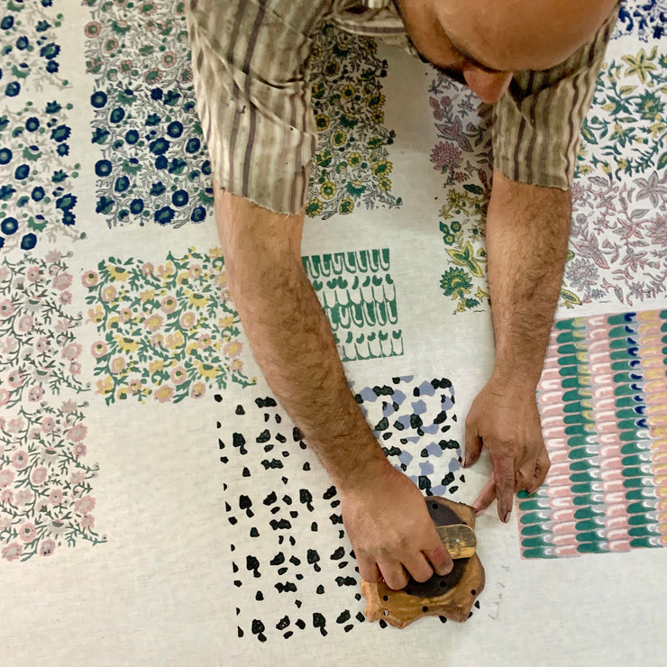 Our block prints are made by 7th generation master printers in the village of Bagru, India, where hand block printing has been practiced for 300 years. Each part of the process takes place in this community: block carving, dyeing, printing, washing, and ironing using heritage methods.